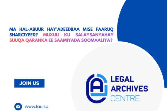 The Legal Archives Centre (LAC) is an independent legal research and policy institute founded in 2023 and based in Somalia. The Center is dedicated to improve access to justice and strengthened the rule of law by providing free, open-access legal information and expert analysis. Using digital innovation, LAC bridges the gap between legal knowledge and the Somali public, offering a range of resources including legal opinions, academic journals, lecture notes, and case law collections.