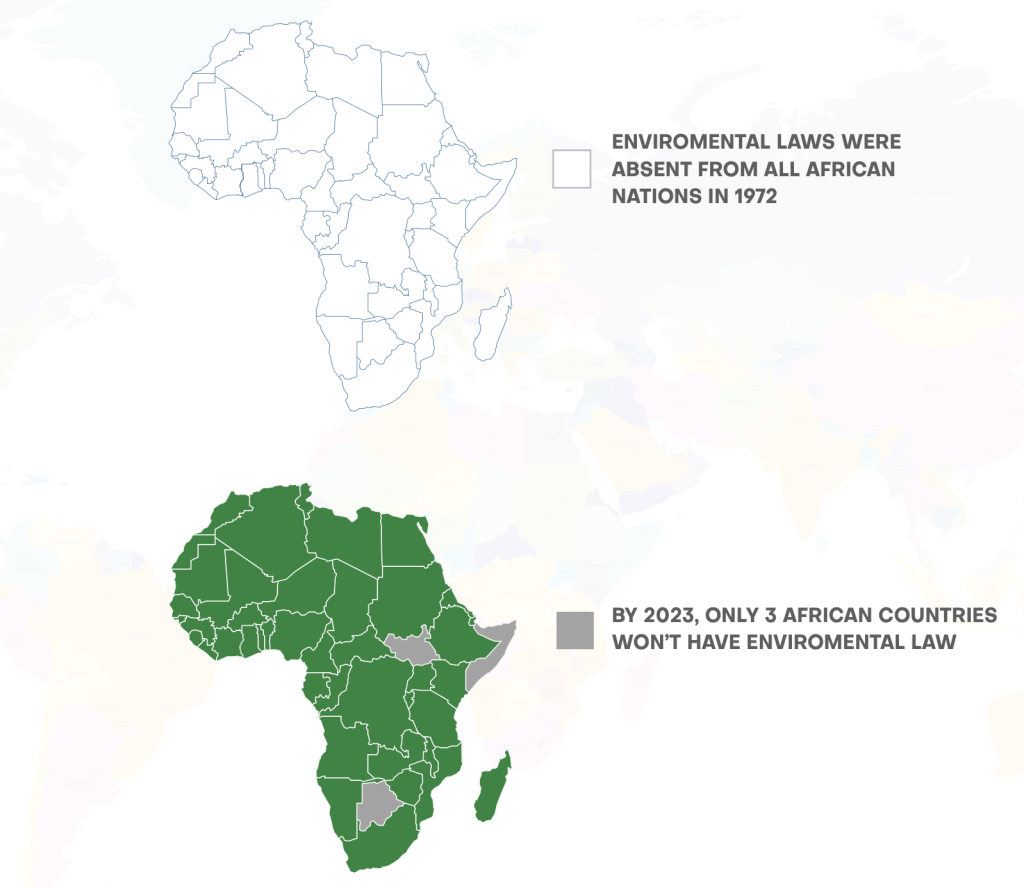 Unfortunately, Somalia’s current environmental laws generally fail in this regard, as they are outdated, ineffective, poorly administered and, not surprisingly, largely ignored. Environmental law has blossomed from its infancy in the early 1970s into young adulthood today. Following the 1992 Rio Earth Summit, countries made a concerted effort to enact environmental laws. Somalia, Botswana, and South Sudan are the only three African nations without an environmental legal framework as of 10th August-2023. It can be shown below figure: