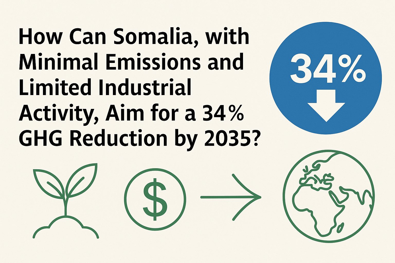 Somalia’s commitment to reducing greenhouse gas (GHG) emissions by 34% by 2035, as outlined in its third Nationally Determined Contribution (NDC 3.0), reflects a bold and forward-looking vision. Although Somalia is among the lowest emitters globally, its pledge signals a strong willingness to align national development with global climate goals. Rather than reflecting high current emissions, the target is based on avoiding future emissions growth under a business-as-usual (BAU) scenario.