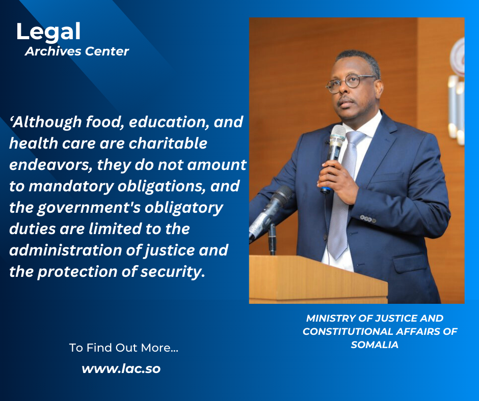 On 22 August 2025, the Ministry of Justice and Constitutional Affairs of Somalia, in remarks to a segment of the public, asserted that while the provision of food, education, and health care may be viewed as charitable undertakings, they do not constitute binding state obligations. This position, emanating not from any ordinary office but from the Constitutional Ministry the very institution entrusted with upholding and interpreting the Constitution of the Federal Republic of Somalia raises profound legal and ethical questions.