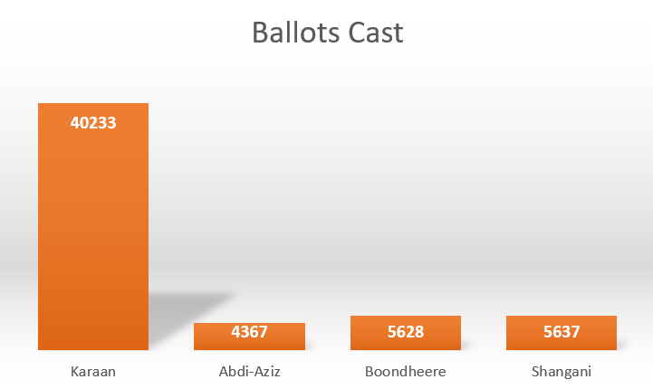 In contrast, AbdiAziiz District recorded the lowest turnout, with only four thousand three hundred sixty-seven (4,367) ballots cast. Similarly, low participation figures were observed in Boondheere with five thousand six hundred twenty-eight (5,628) ballots and Shangani with five thousand six hundred thirty-seven (5,637) ballots. These disparities suggest that turnout correlates closely with demographic size and urban settlement patterns rather than with legal exclusion or procedural barriers.